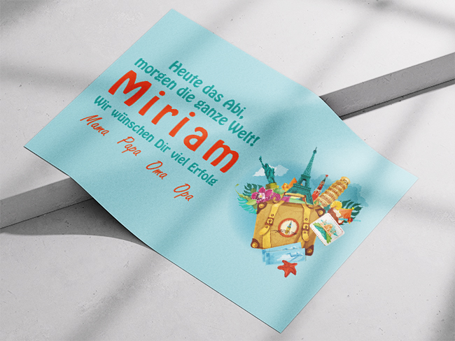 Bestelle jetzt dein Abiplakat auf Papier mit deinem Wunschmotiv! Einfach Motiv bei den Abibannern auswählen, die Artikelnummer eingeben und deine Personalisierungsdaten hinterlegen – schon ist dein einzigartiges Abiplakat in Produktion.